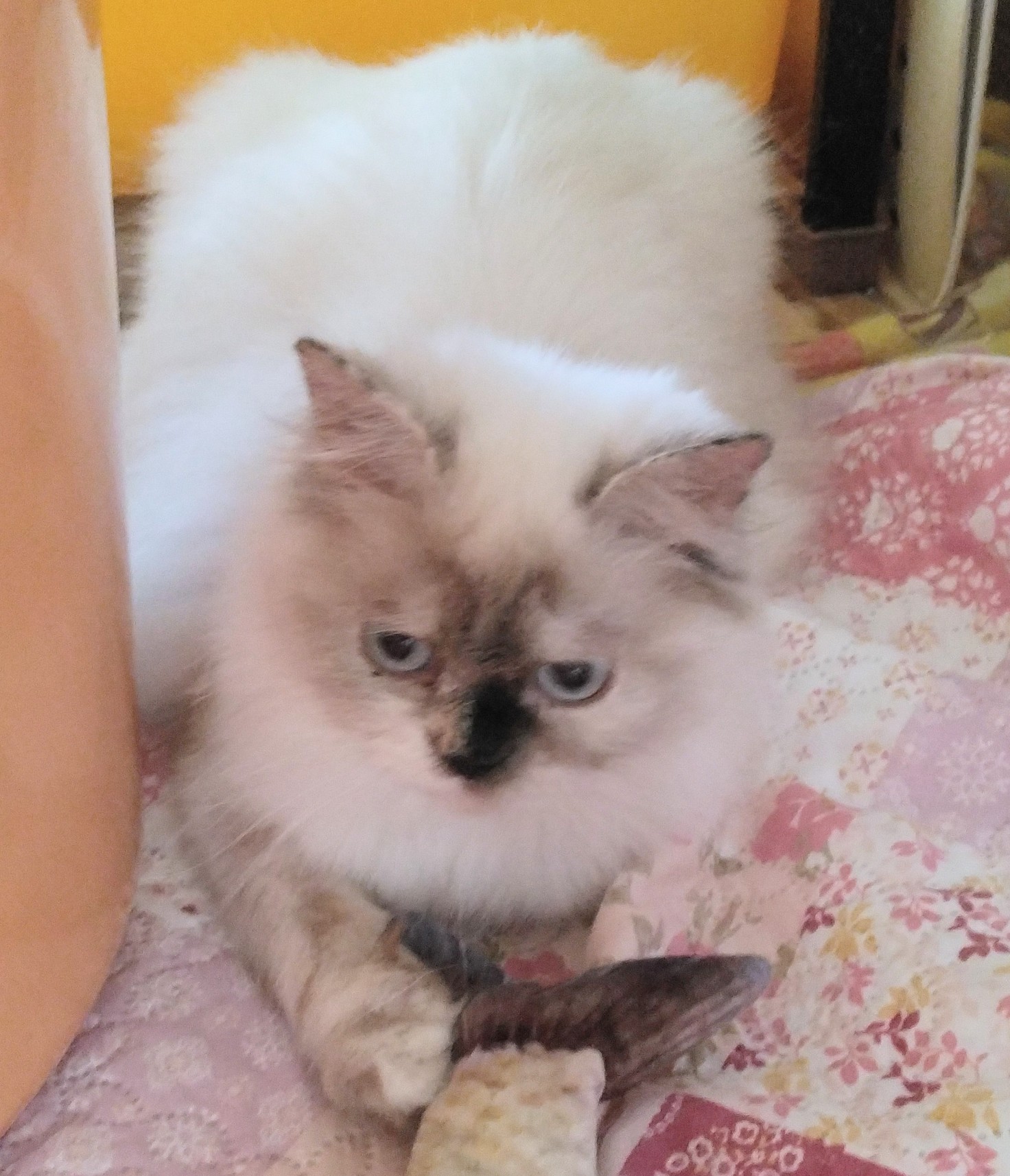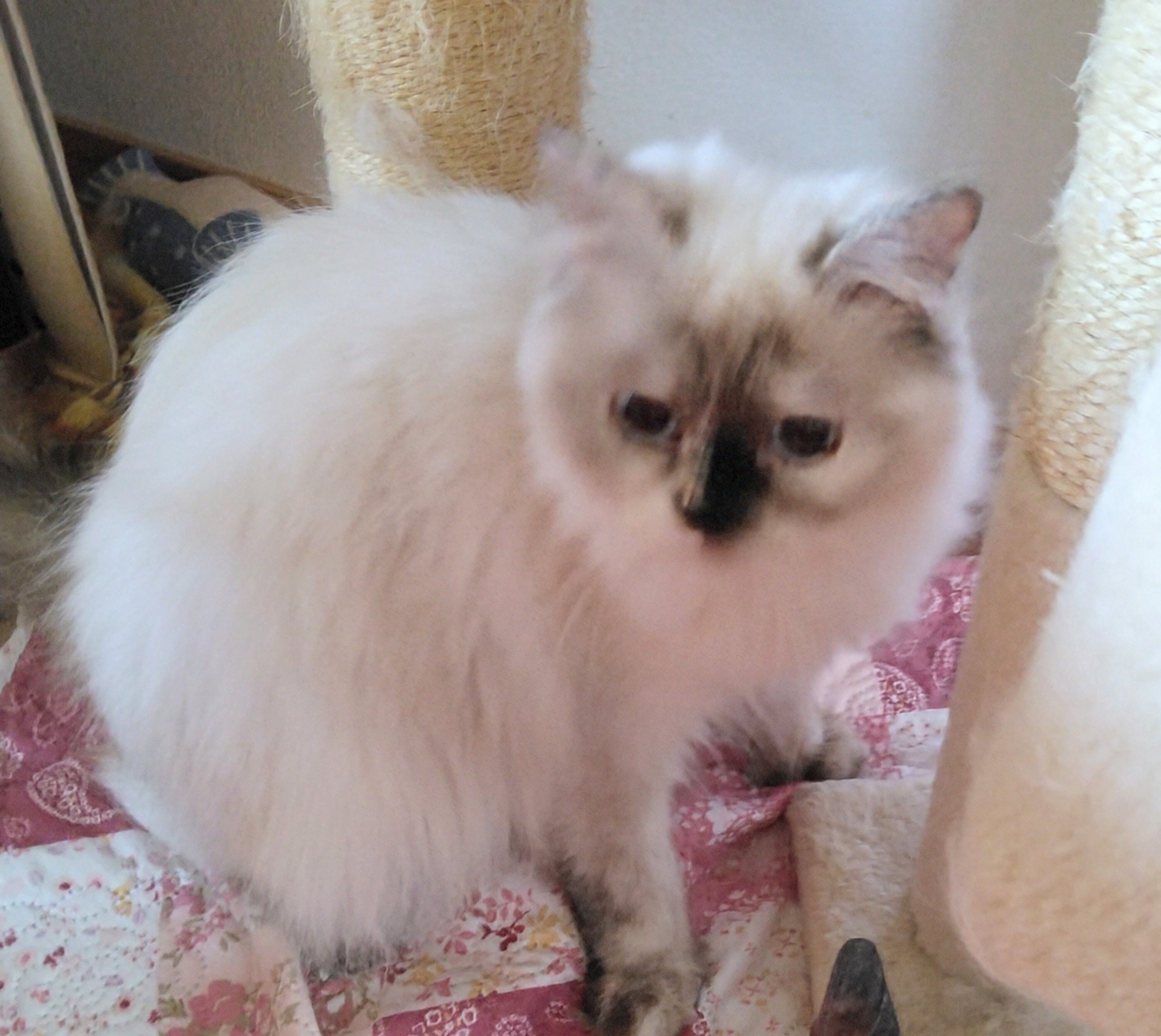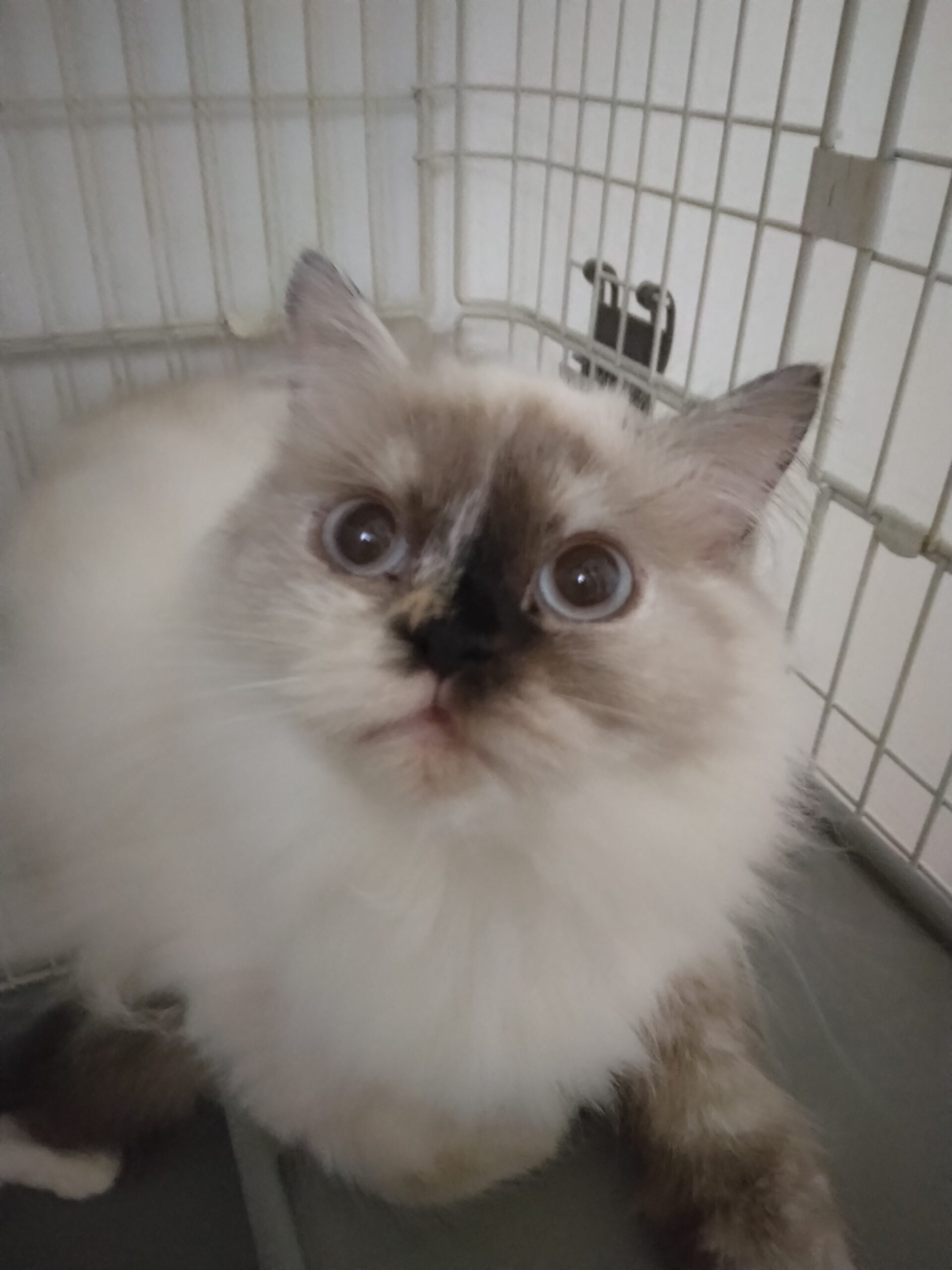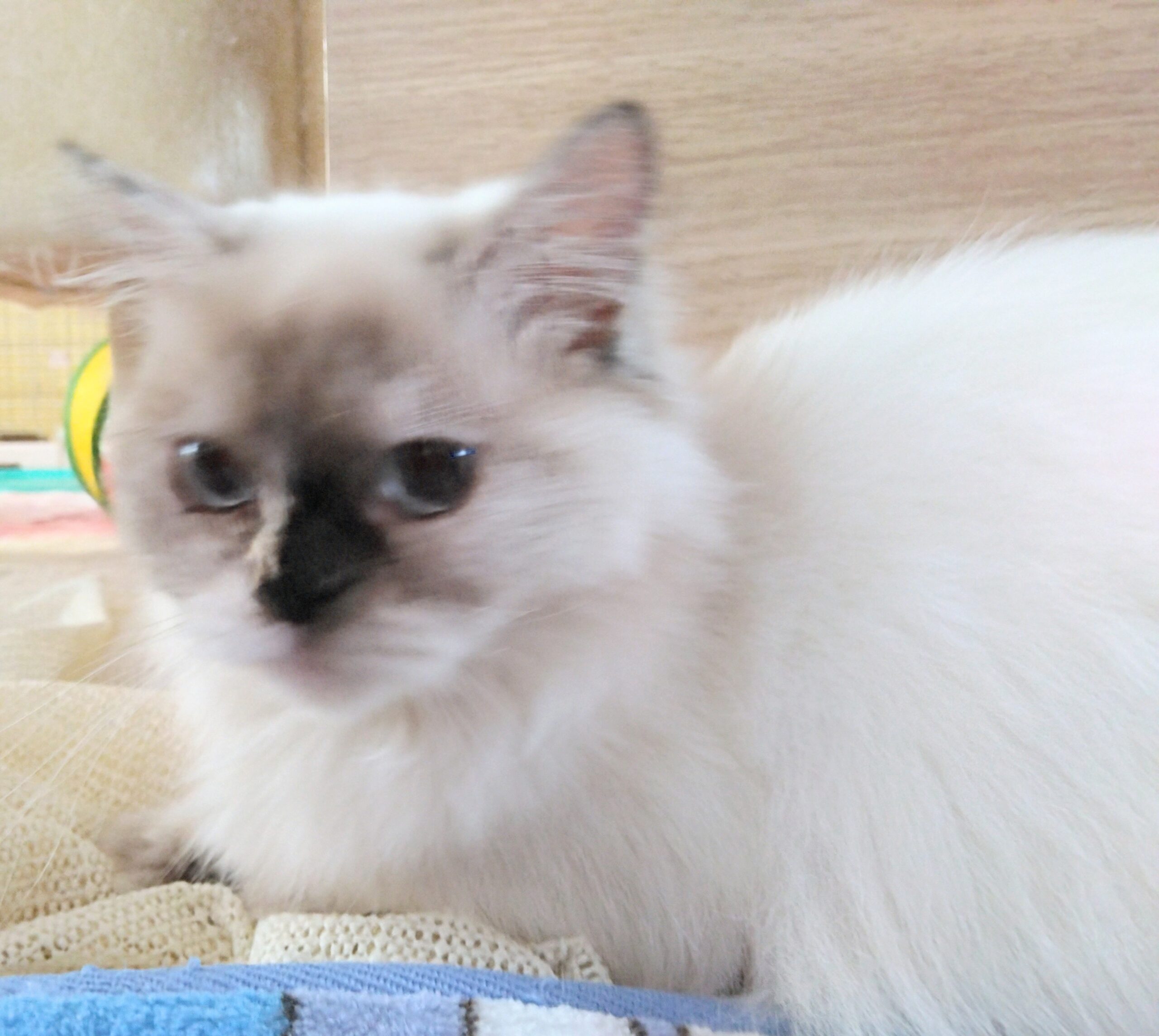 2024年10月19日生まれ、少し小柄なトーティポイントです。お鼻の右側にほんのり白い模様が入った個性的な毛色がトレードマークです。