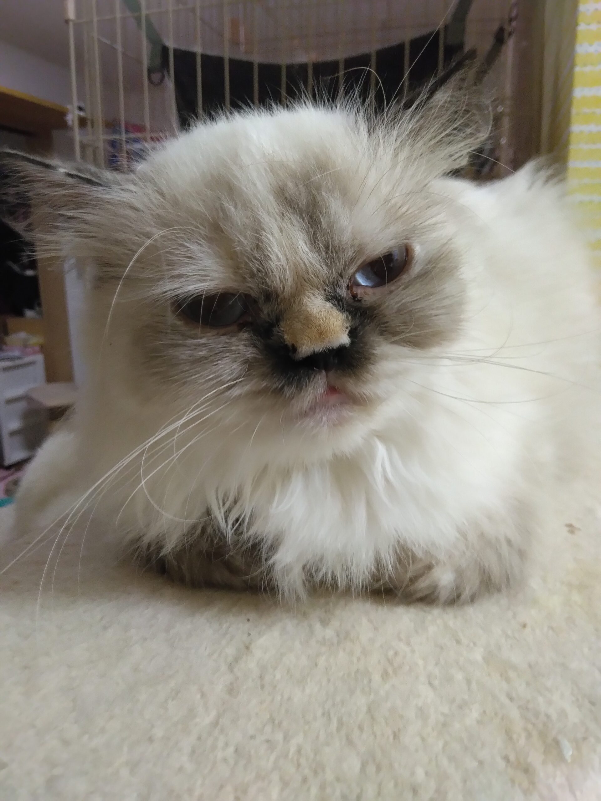 ヒマラヤンの中でも珍しい、女の子だけに現れるトーティポイントの毛色と、澄んだサファイアブルーの瞳が魅力の小柄な女の子です(体重3.2kg)。お鼻が白いのがトレードマーク。
