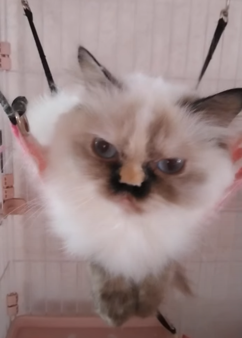 ハンモックでヘソ天になる姿も可愛らしく、食事はしっかり完食派。グルーミングや爪切りもお利口で、トイレも完璧。ほとんど鳴かず、他の猫とも仲良くできます。